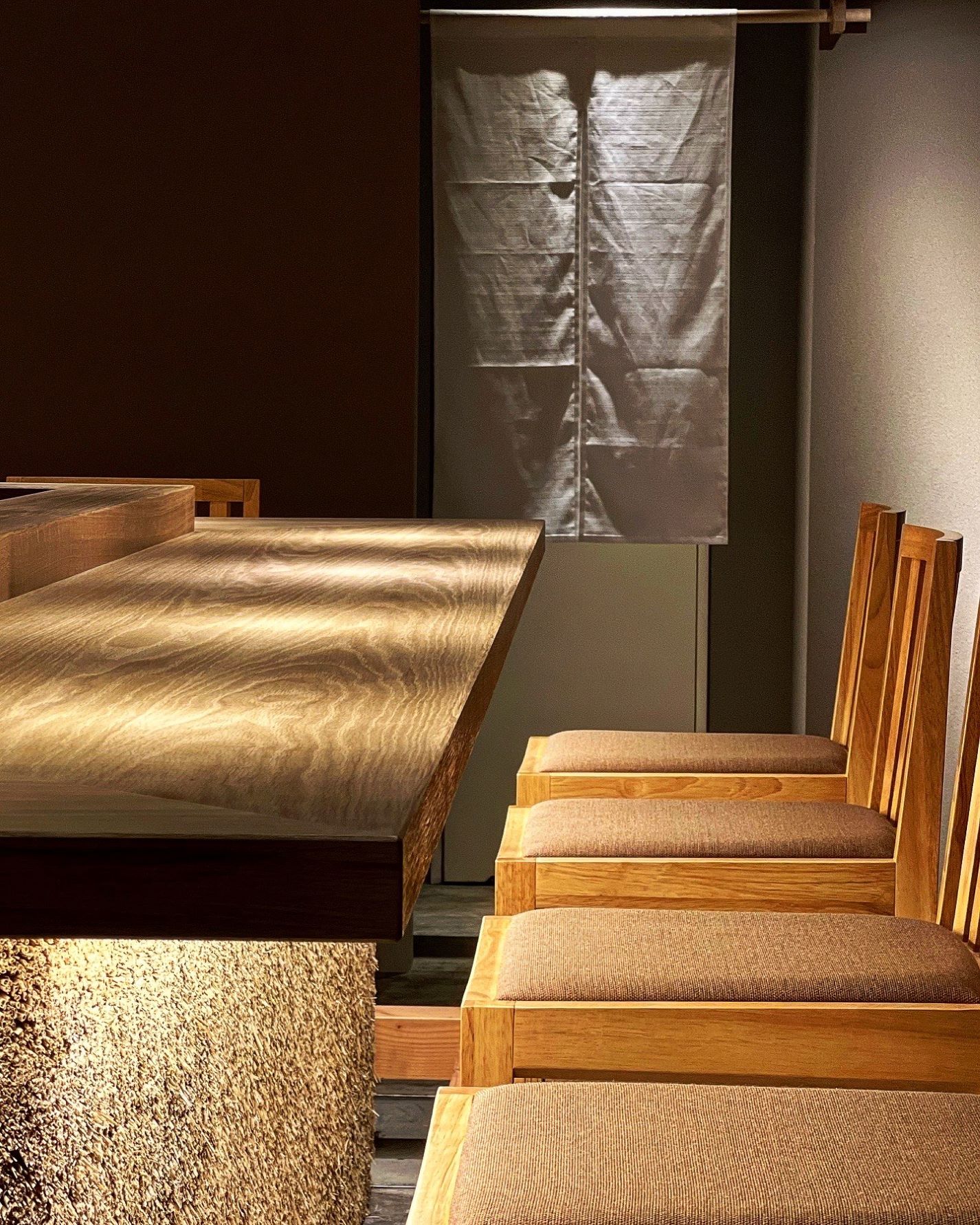 カウンターの腰壁が、稲藁による茅壁になっています。