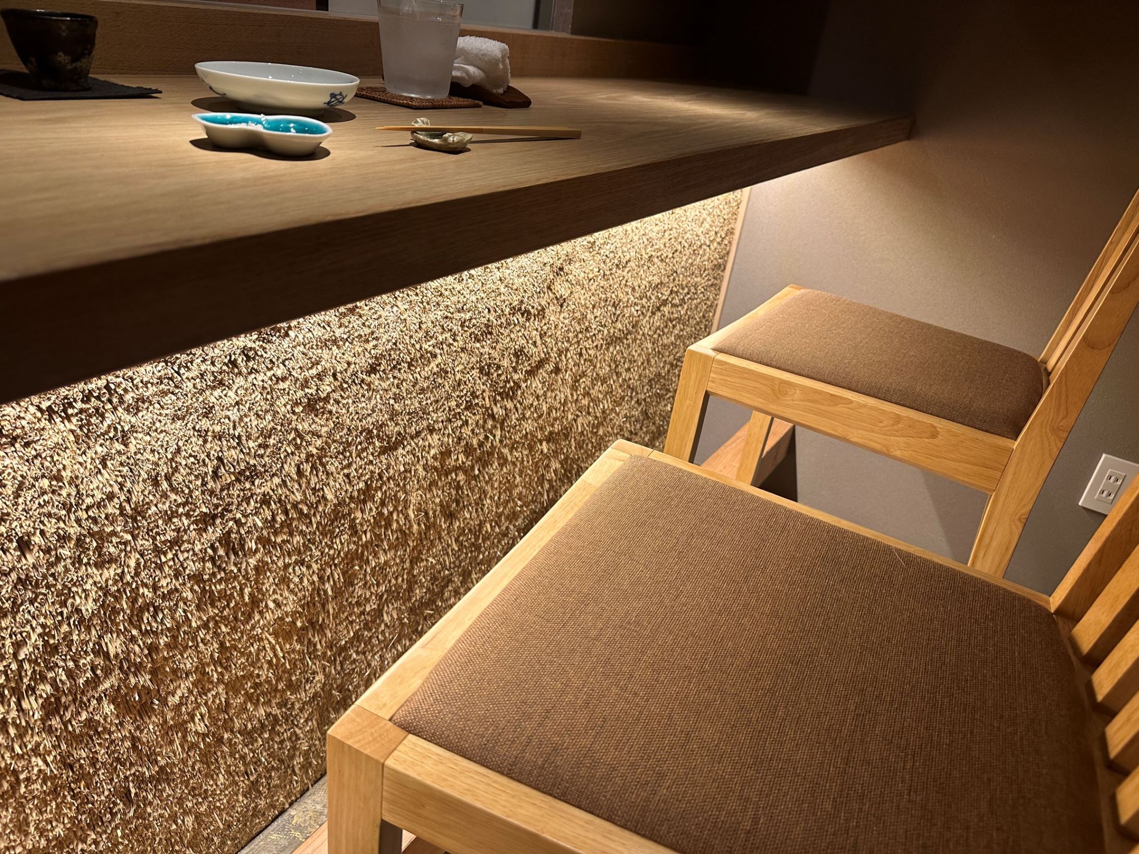 カウンターの腰壁が、稲藁による茅壁になっています。